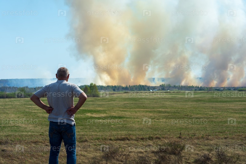 Бушующий лесной пожар за горизонтом, огонь угрожает домам, стоящим на опушке леса, размытый фокус