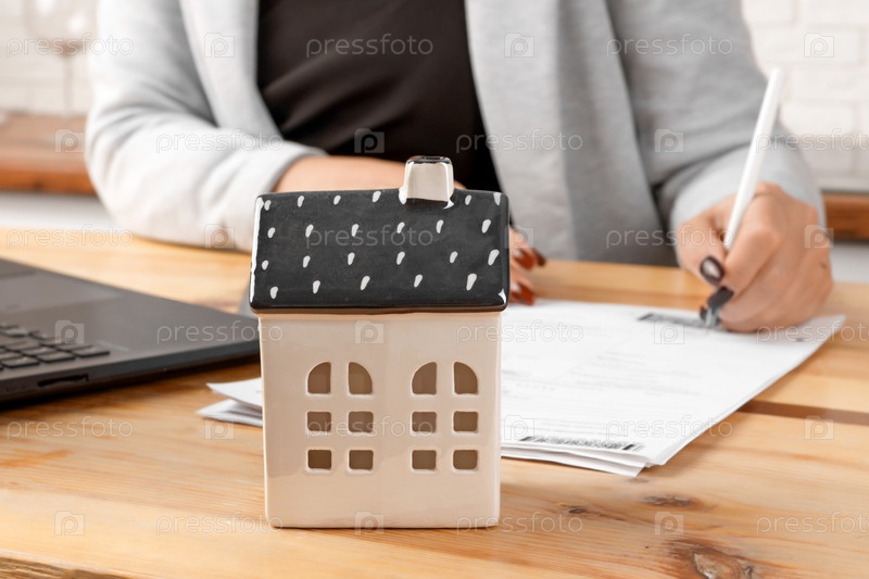Бизнес-леди подписывает документы левой рукой на фоне модели дома на фоне кухонной мебели. Концепция покупки дома, ипотечной недвижимости