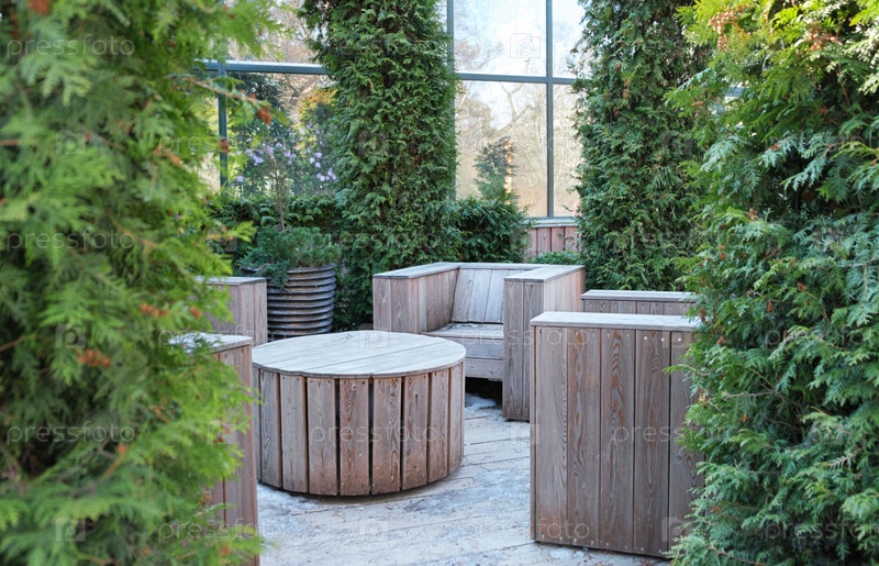 Место отдыха с деревянной зоной отдыха в окружении вечнозеленых туй. Деревянные кресла и круглый стол. Уютная зона для отдыха на заднем дворе в саду