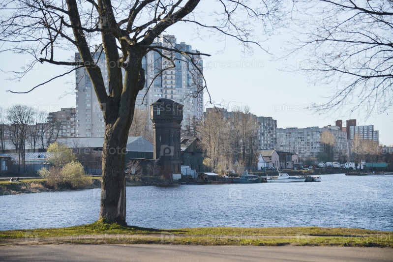 Водонапорная башня у водоема в парке. Историческое строение на фоне новостроек