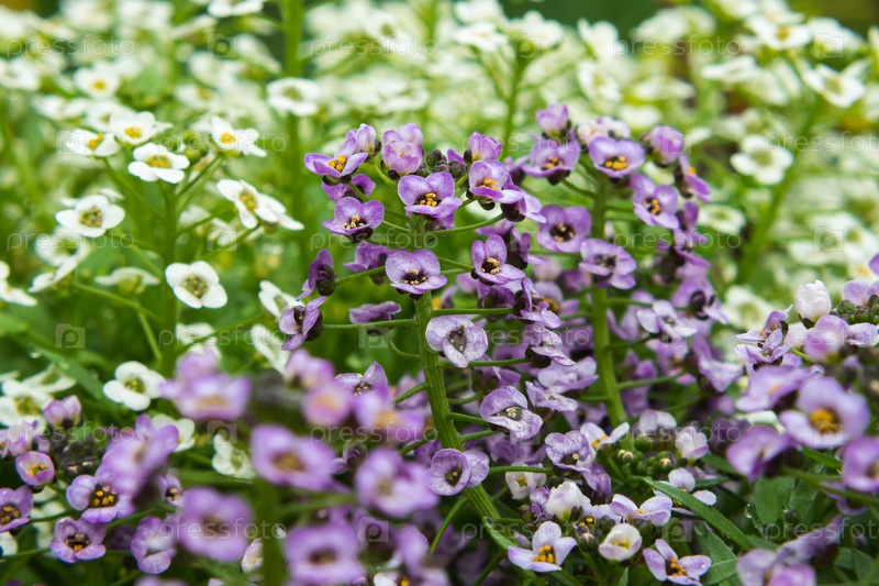 Крупный план белых и розовых цветов лобулярии на заднем дворе. На зеленых листьях видны капельки росы. Выборочный фокус
