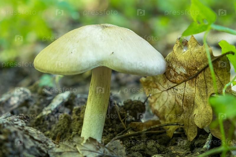 Белый несъедобный гриб в лесу среди листьев. Дикий ядовитый гриб. Крупный план