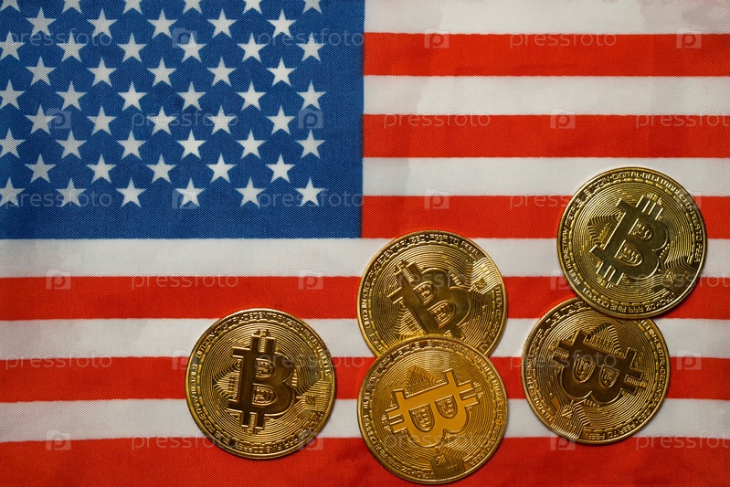Золотые монеты криптовалюты биткойн лежат на флагмане США. Вид сверху. Технология блокчейн