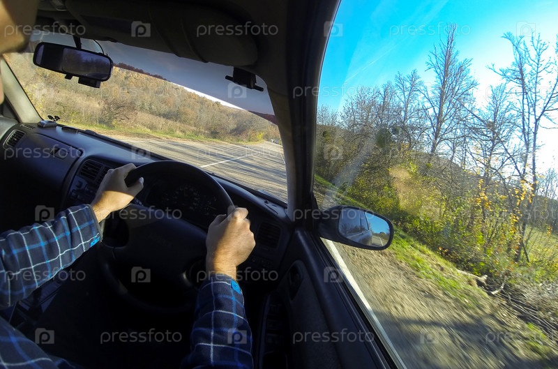 Вид из салона автомобиля на руки и руль. Машина едет по осенней дороге. Концепция путешествия