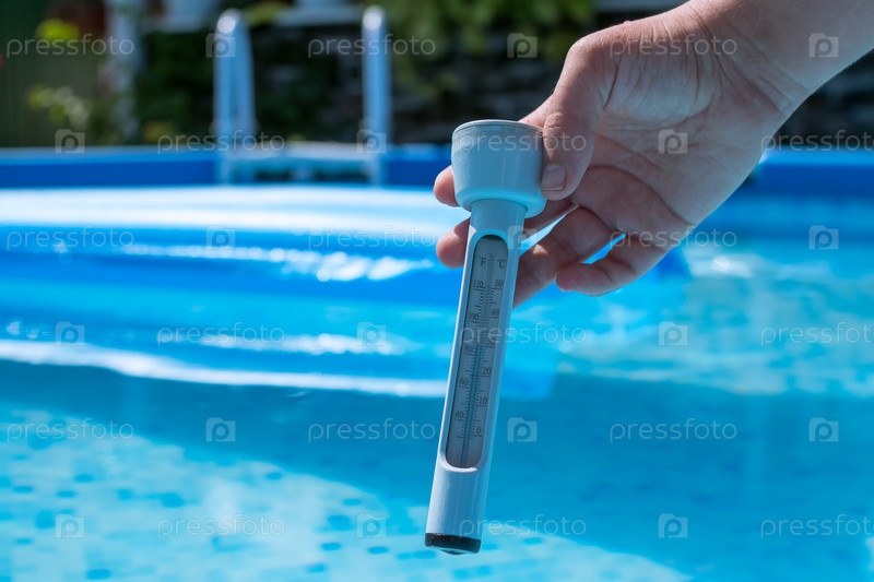 В руке женщины находится термометр для измерения температуры воды в бассейне. На заднем плане бассейн с голубым надувным матрасом