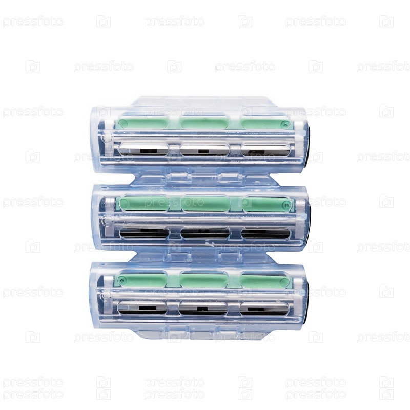Пакет сменных лезвий бритвы изолирован на белом фоне. Крупный план