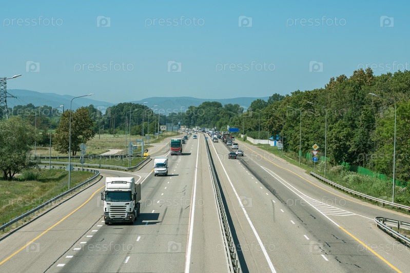 Скоростная дорога с грузовиками и легковыми автомобилями на фоне голубого неба и гор. Трасса М4 Дон на юге России