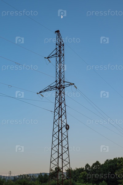 Пилон высоковольтной линии электропередач на фоне вечернего голубого неба с луной