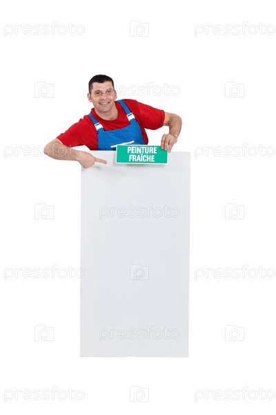 Рабочий со знаком "осторожно, покрашено!" указывает на пустой плакат