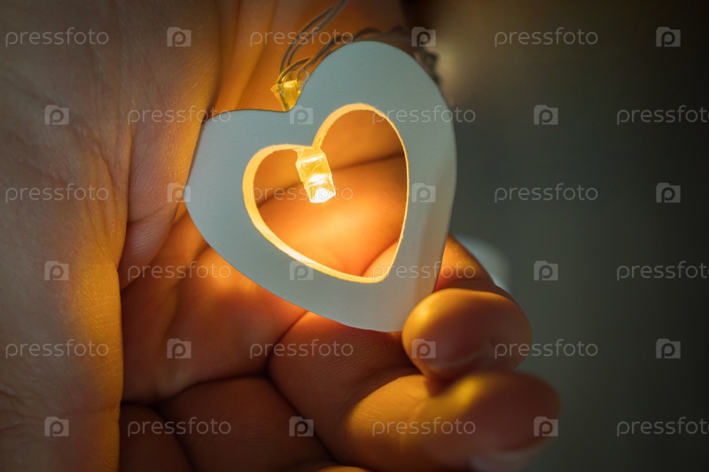Мужская рука держит светящееся желтое сердце. Концепция Дня святого Валентина. 14 февраля – День всех влюбленных. Крупный план, вид сверху