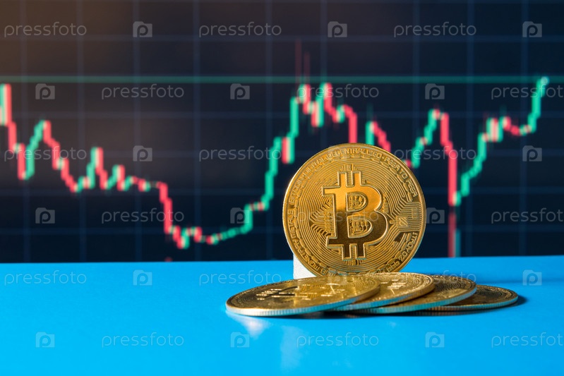 На синем фоне монет BTC за ними расположен график роста и падения стоимости криптовалюты биткоин