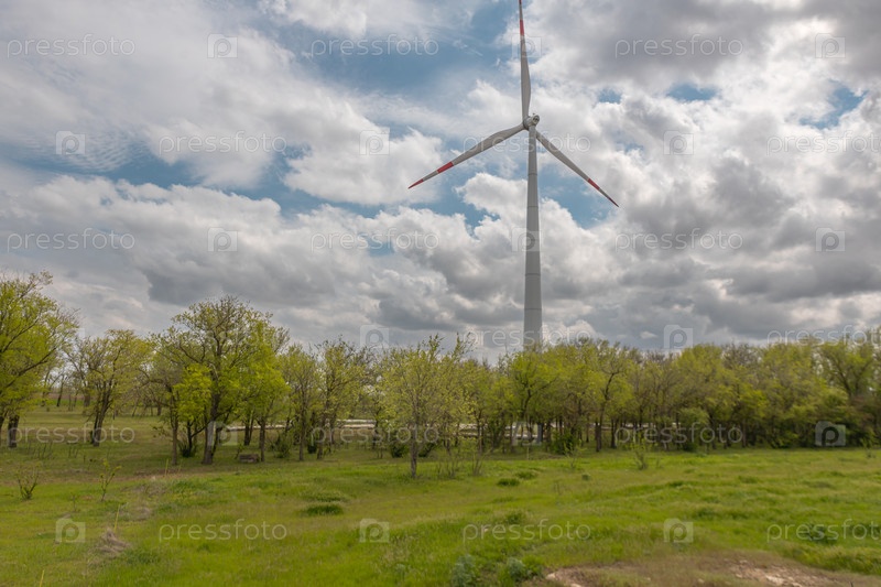 Ветряные турбины на фоне летнего пейзажа с голубым небом, белыми облаками