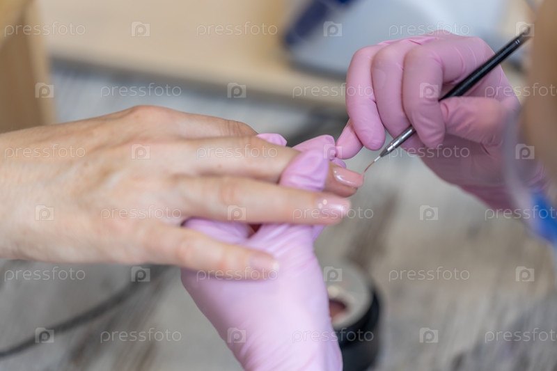 Деталь маникюра ногтей с файлом или кистью. Женщина красивый процесс ухода за ногтями