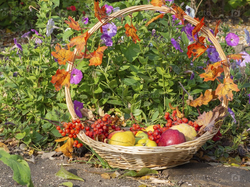 Осенняя концепция: спелые яблоки, груши, айва, в корзине возле цветов в саду