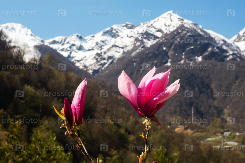 Розовые цветы магнолии цветут в дикой природе на фоне заснеженных гор. Магнолия звездчатая, выборочный фокус