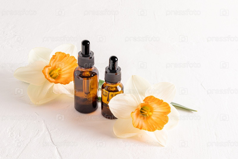 Сыворотка для лица в стеклянных косметических флаконах с пипеткой для ежедневного ухода за кожей на белом текстурированном фоне со свежими нарциссами. натуральная косметика