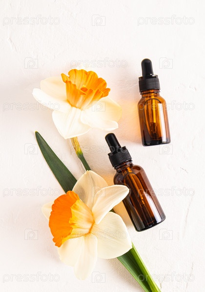 Вид сверху на две косметические бутылки с органическим средством по уходу за кожей лица и тела. обогащение кожи витаминами. белый фон