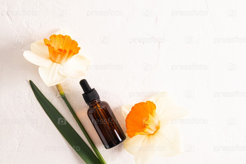 Косметическая бутылка из темного стекла с капельницей на белом текстурированном фоне с весенними цветами с копией пространства. ультраувлажняющая сыворотка