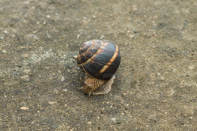 Большая коричневая улитка с рожками на бетоне. Римская, бургундская или эскарготная улитка. Крупный план