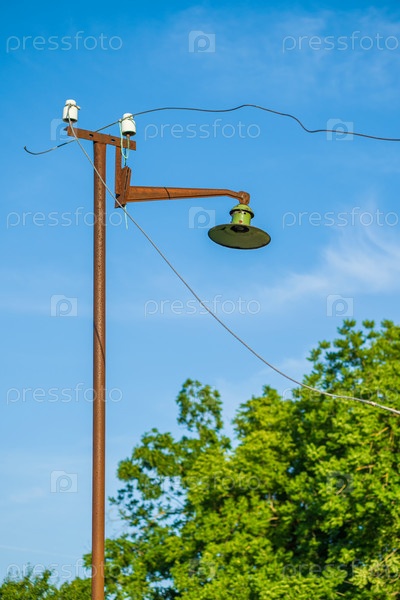 На ржавом столбе стоит старый уличный фонарь с разбитой лампочкой и оборванными проводами. На заднем плане дерево с зелеными листьями и голубым небом