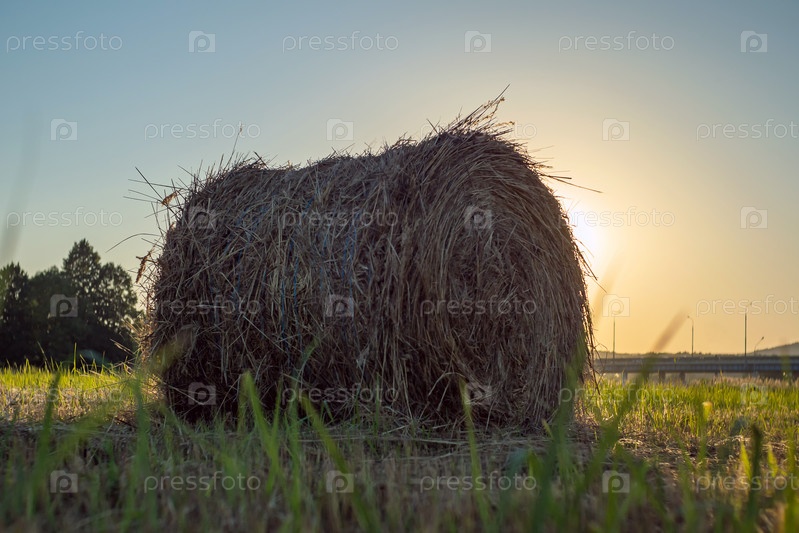 Крупный план круглого тюка сена на свежескошенном поле. Нижний угол. На заднем плане деревья, голубое небо и заходящее солнце. Заготовка сена на зиму для кормления скота