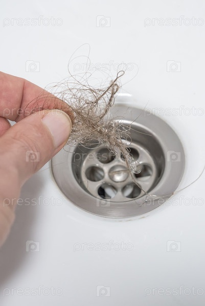 Мужская рука очищает слив ванны от пучка светлых волос. Крупный план. Проблема выпадения волос