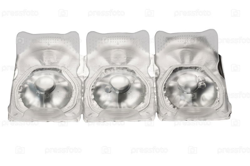 Упакованные контактные линзы для повседневного ношения, изолированные на белом фоне. Комплект из трех штук