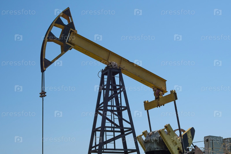 Желтая нефтяная вышка перекачивает нефть на фоне голубого неба. Добыча черного золота из скважины