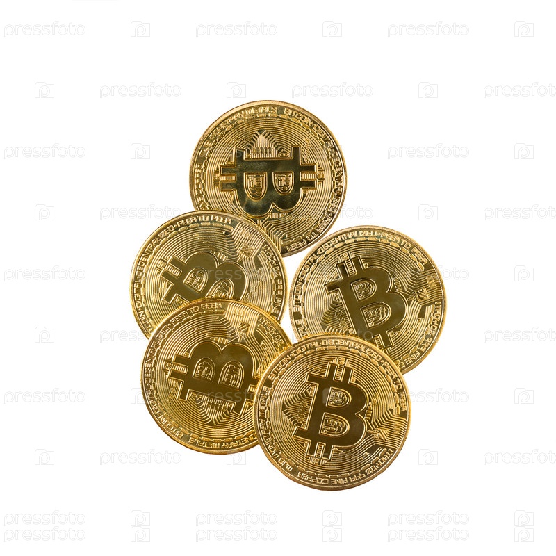 Биткойн монеты, изолированные на белом фоне. Криптовалюта БТЦ. Технология блокчейн. Вид сверху, крупный план
