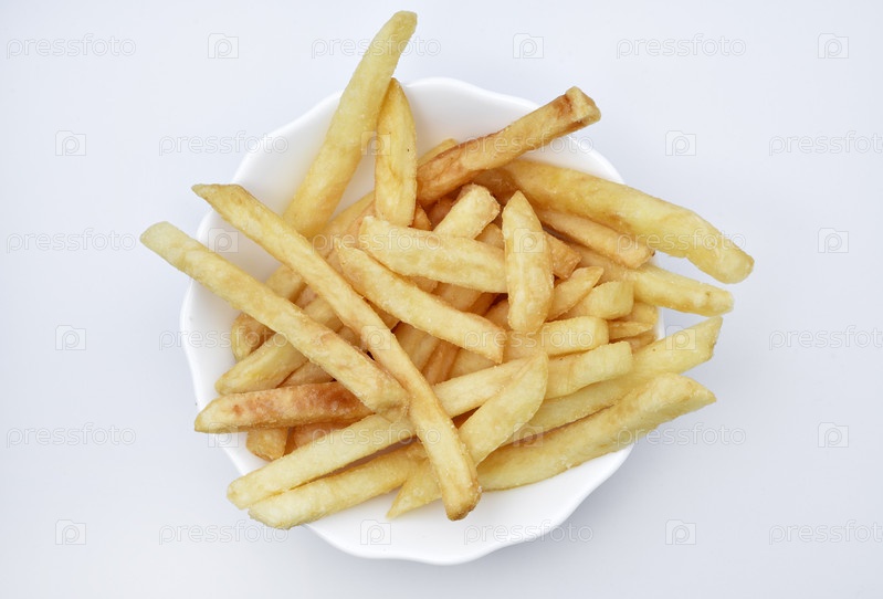 Ломтики картофеля фри на белой тарелке. Вкусный жареный картофель. Быстрое питание