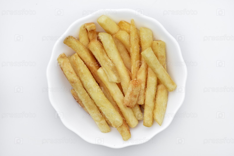 Ломтики картофеля фри на белой тарелке. Вкусный жареный картофель. Быстрое питание
