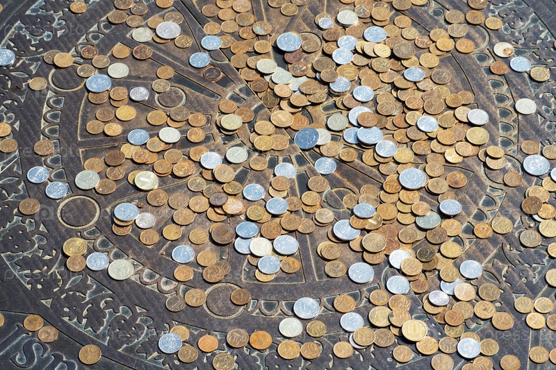Место с монетами для желаний. Концепция загадывания желаний. Крупный план. 07 августа 2022 г. - Россия, г. Казань