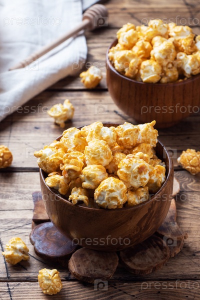Попкорн в карамельной глазури в деревянных тарелках на деревенском столе