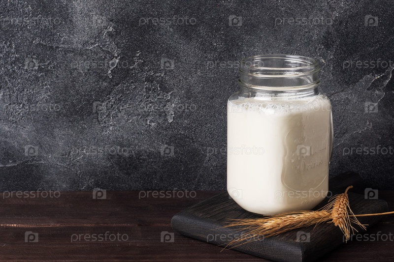 Стеклянная банка с молоком на темном фоне. Скопируйте пространство