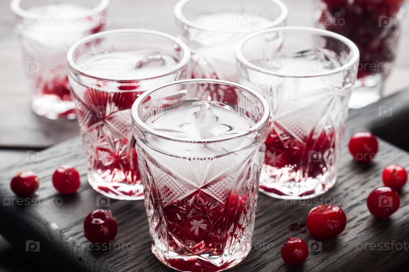 Стеки водки и клюквы на деревянной подставке и фоне. Копия пространства. Настойка алкогольного напитка барная
