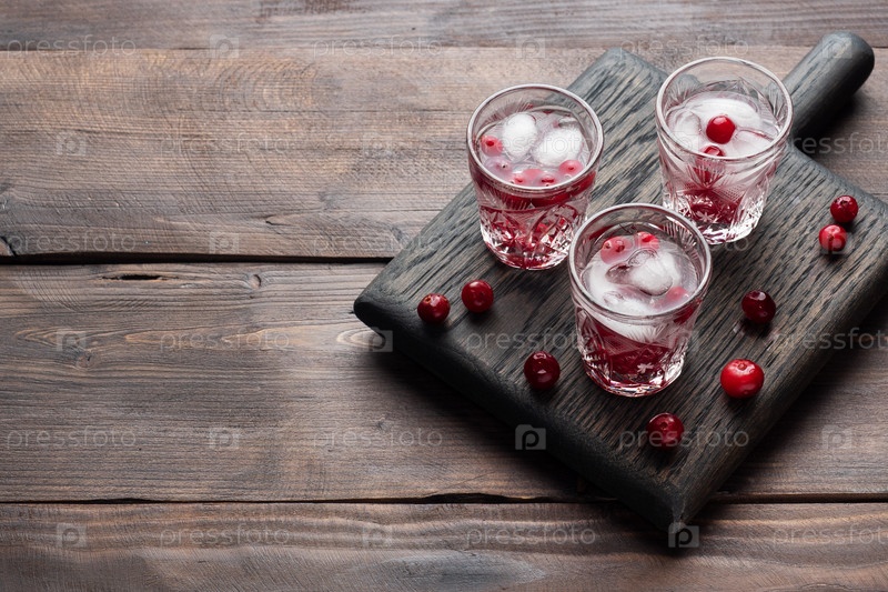 Стеки водки и клюквы на деревянной подставке и фоне. Копия пространства. Настойка алкогольного напитка барная