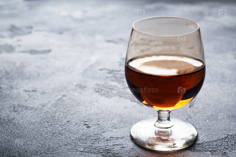 Алкогольный напиток в стакане бренди коньяка. Темный бетонный фон. Скопируйте пространство