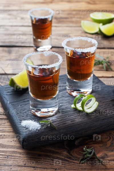 Стекло с алкоголем, солью и лаймом на деревянном фоне. Коньяк виски текила. Концепция вечеринки. Селективный фокус Копирование пространства