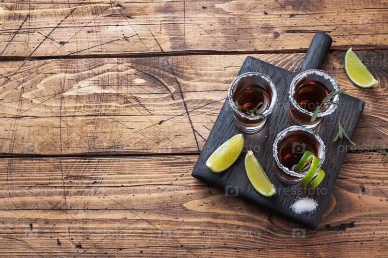 Стекло с алкоголем, солью и лаймом на деревянном фоне. Коньяк виски текила. Концепция вечеринки. Селективный фокус Копирование пространства