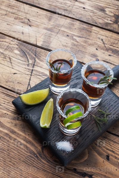 Стекло с алкоголем, солью и лаймом на деревянном фоне. Коньяк виски текила. Концепция вечеринки. Селективный фокус Копирование пространства