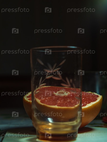 Пустой стеклянный стакан и половина грейпфрута на столе, здоровая еда