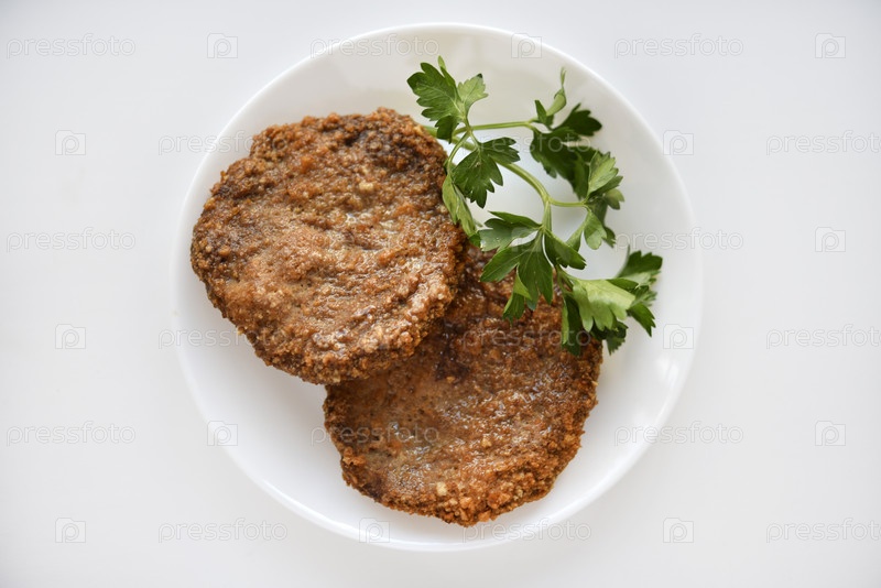 Две мясные котлеты на белой тарелке. Мясной завтрак