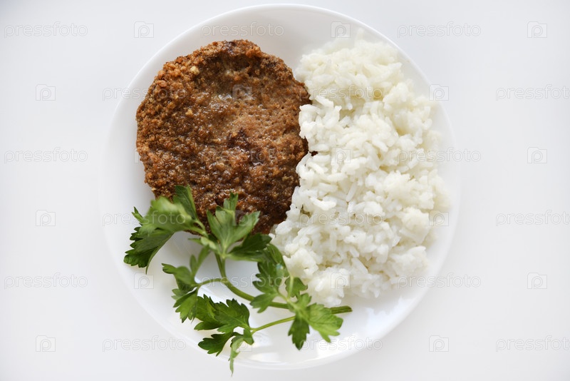 Две мясные котлеты с рисом на белой тарелке. Мясной завтрак с рисовой кашей