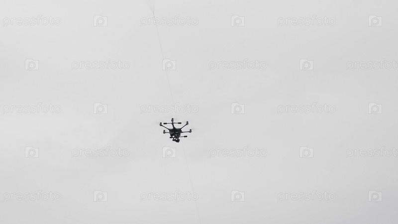 Летающий вертолетный дрон на фоне белых облаков