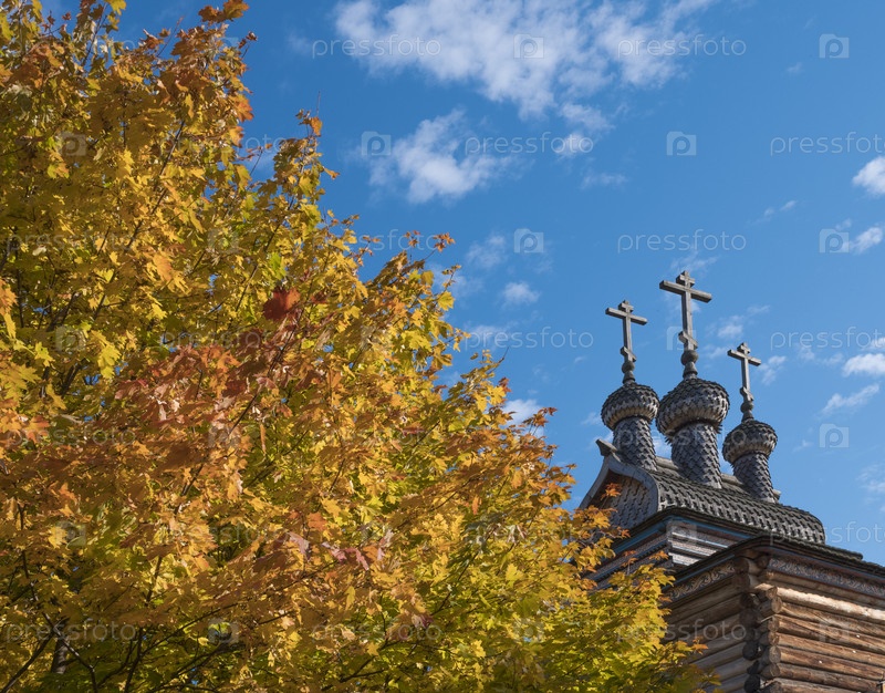 Осенний пейзаж с колокольней церкви в России