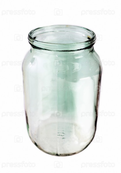 Пустая стеклянная банка на белом фоне