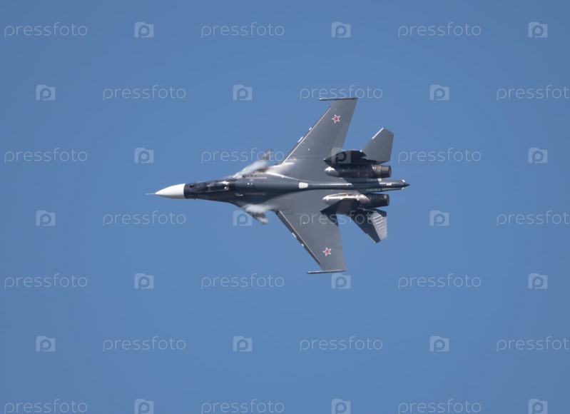 Москва Россия Аэродром Жуковский 31 августа 2019 года: пилотажный Су-30 выполняет демонстрационный полет международного аэрокосмического салона МАКС-2019