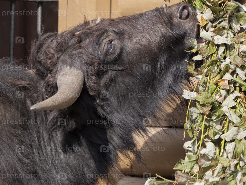 Таро Баффало ест свежие зеленые ветки деревьев