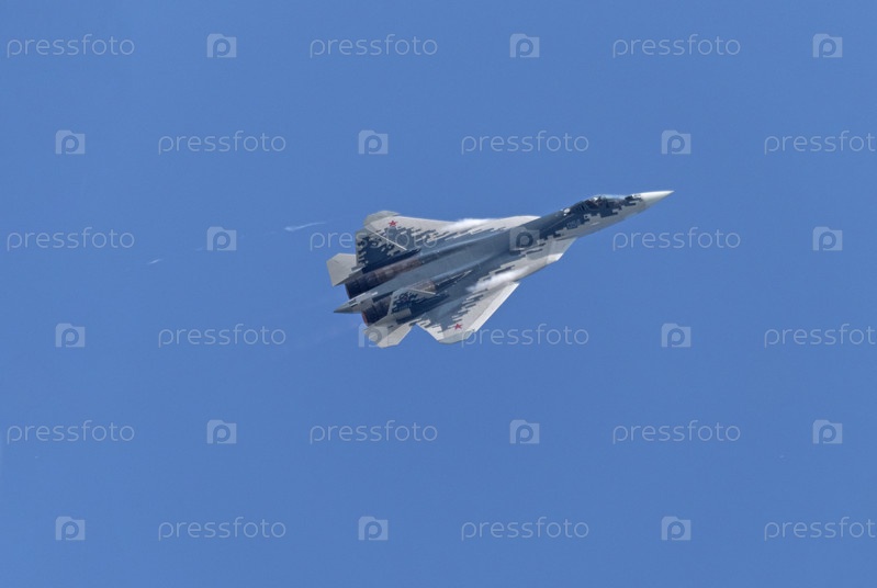 Москва Россия Аэродром Жуковский 31 августа 2019 года: Демонстрация новейшего российского истребителя Су-57 на международном аэрокосмическом салоне МАКС-2019