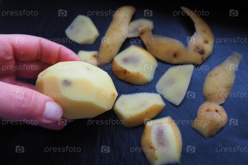 Грибковое, вирусное или бактериальное поражение клубня картофеля. Темные пятна внутри картофеля. Очищенный сырой картофель с пятнами и дыркой в женской руке. Безопасности пищевых продуктов. Опасность фермерских натуральных продуктов